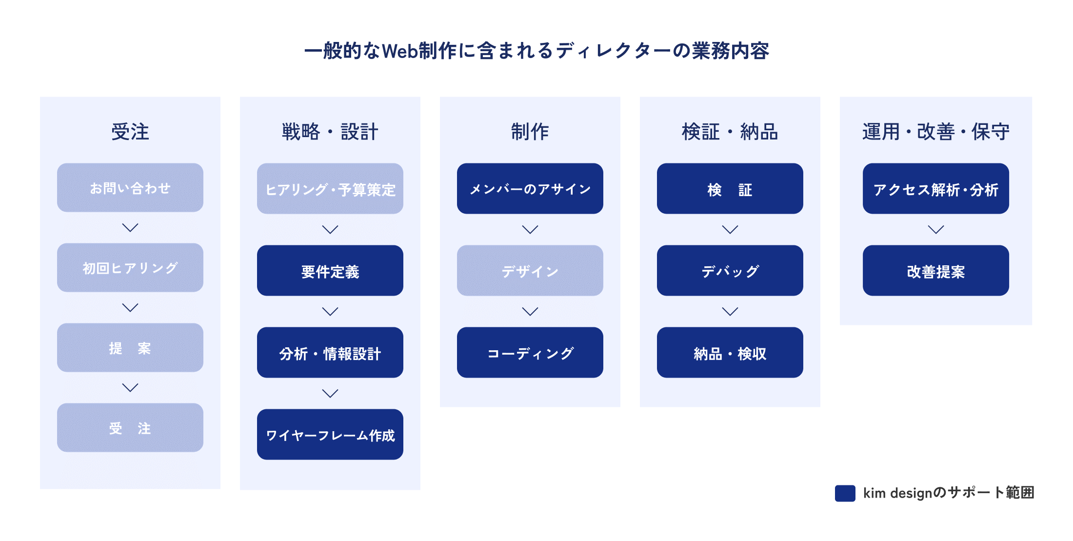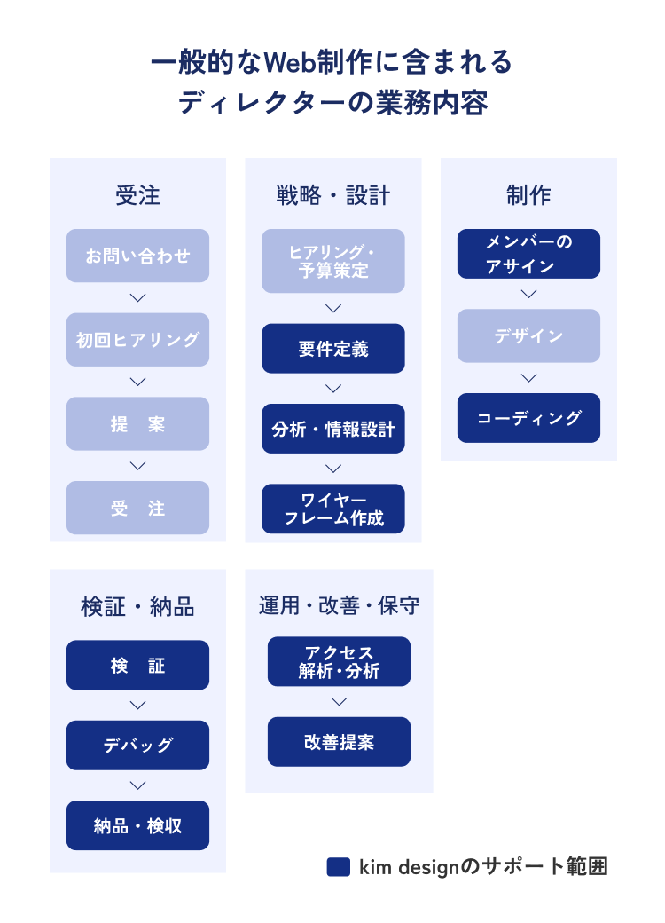 この中でも、kim designでは、太線で示した「要件定義」「情報設計・分析」「ワイヤーフレーム作成」「メンバーのアサイン」「検証」「納品・検収」「改善提案」など、設計と品質に直結するパートを得意とし、サポートしています。